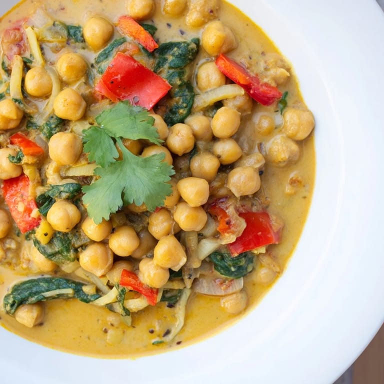 This isn't a complicated curry that demands technique or fancy ingredients—it's built on the simple truth that good spices in hot oil, simmered with coconut milk, create something deeply satisfying. The chickpeas give you substance without heaviness, and the one-pot method means the flavors all build together rather than separately. It's the kind of dish that tastes better on day two when everything has had time to really know each other.