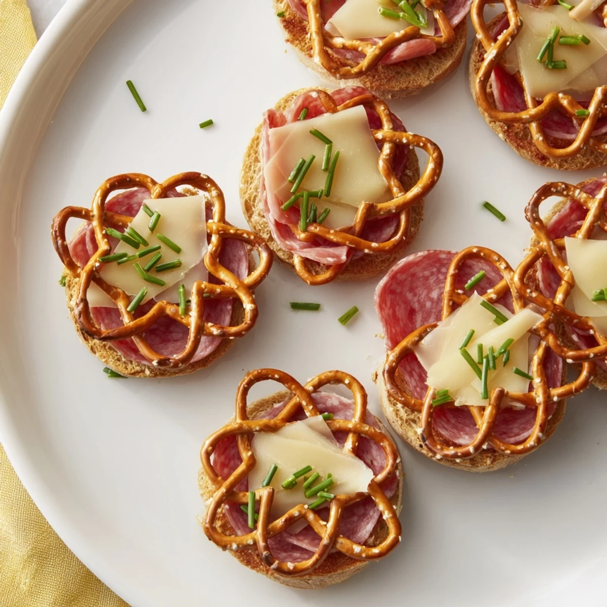 Save The first time I made this, I was hosting a casual dinner and wanted something that looked impressive without requiring actual cooking. I started arranging cured meats on toasted bread, added some cheese, and then thought: what if I could make it visually striking? That's when I grabbed a handful of pretzel sticks and started weaving them on top like a window frame. My guests literally gasped when they saw it, and I realized I'd stumbled onto something special—a dish that feels fancy but comes together in under twenty minutes.