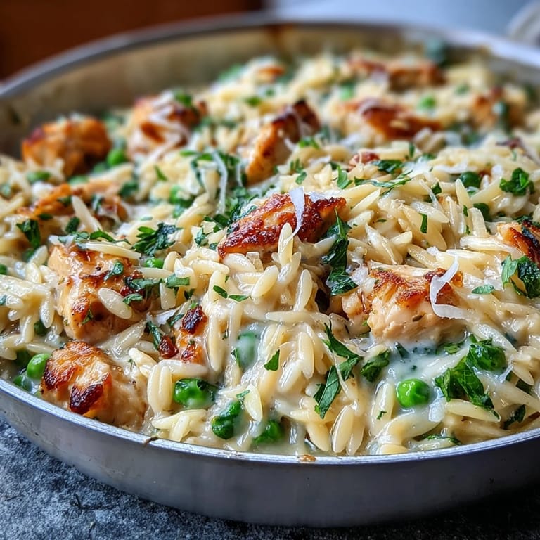 Save The scent of lemon and garlic filled the kitchen the first time I improvised this one-pot meal after a busy spring afternoon. With rain tapping on the window and muddy shoes by the door, I wanted something simple yet bright—something that tasted like sunshine but didn't demand much cleanup. As orzo simmered, its creamy texture and the soft snap of peas became the antidote to the gray outside. Chicken cooked tenderly, absorbing every herb, while the Parmesan melted in without a fuss. It's a recipe that rewards you with comfort and convenience all in one.
