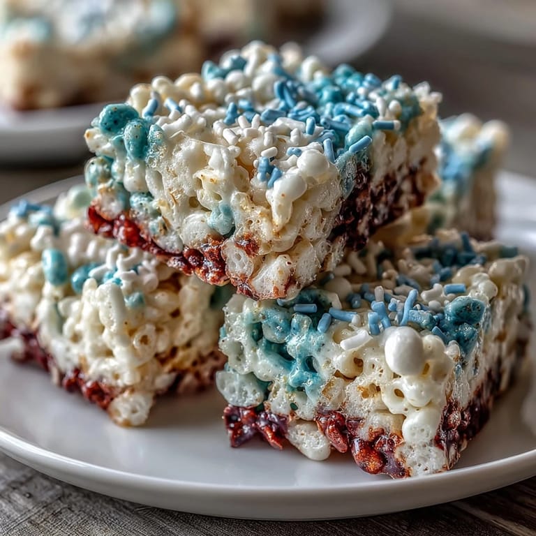 Save Every Fourth of July, my kitchen transforms into a patriotic command center, and these layered Rice Krispies treats have become the unofficial flag of our dessert table. There's something about stacking red, white, and blue that makes even the simplest recipe feel like a celebration. My kids press their noses against the counter as each color gets added, trying to guess which layer will taste sweetest. The whole process takes maybe thirty minutes, but the anticipation stretches it into an afternoon event. It's become the one dessert everyone requests before the fireworks even start.