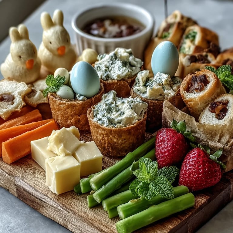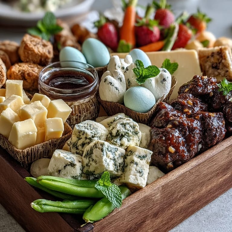 Save The first time I put together a spring charcuterie board was while listening to light rain patter against the window, trying to coax bits of color from my fridge for a family gathering. The way the pastel chocolate eggs and fresh herbs dotted the landscape made it feel more like an artist's canvas than an appetizer spread. My cat watched every step with skeptical curiosity, nose twitching at the scent of prosciutto. I remember laughing at my attempt to roll smoked ham into tiny baskets, realizing it's harder than it looks. By the end, the room smelled faintly sweet—honey blending with the grassy scent of basil.