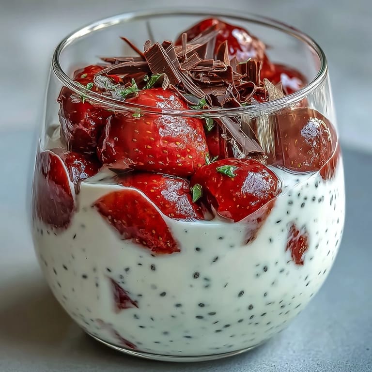 This is the kind of recipe that actually improves with planning—make the pudding the night before and you're genuinely minutes away from breakfast the next morning. The strawberries can be macerated up to four hours ahead without losing texture, though I prefer to do it no more than an hour before serving when they're still just barely firm. You can even assemble the whole thing the night before, though adding the chocolate shavings right before eating keeps them from softening into the pudding.