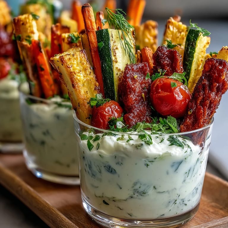 Save This recipe comes together quickly with simple, wholesome ingredients. Preparing the vegetables into sticks or bite-sized pieces ensures each cup is overflowing with crunch and color, while the homemade ranch dip, made from Greek yogurt and fresh herbs, brings the perfect creamy accompaniment that’s lighter and healthier than store-bought alternatives.