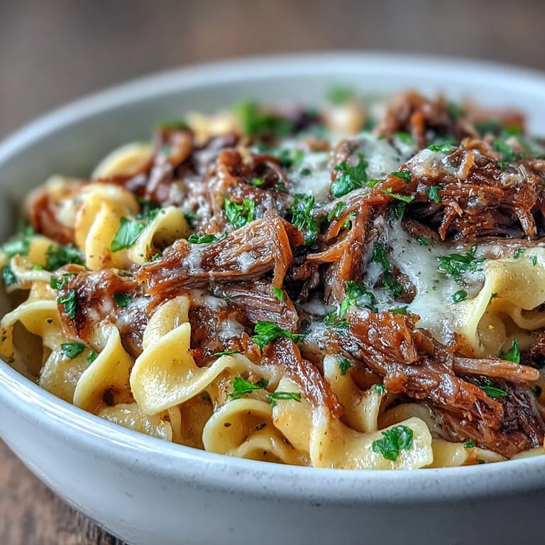 - Spoon the buttered noodles onto plates or bowls, top generously with shredded beef and all that rich onion gravy, then sprinkle with cheese and fresh parsley if you like. Taste a spoonful and adjust the seasoning—you might need a pinch more salt.